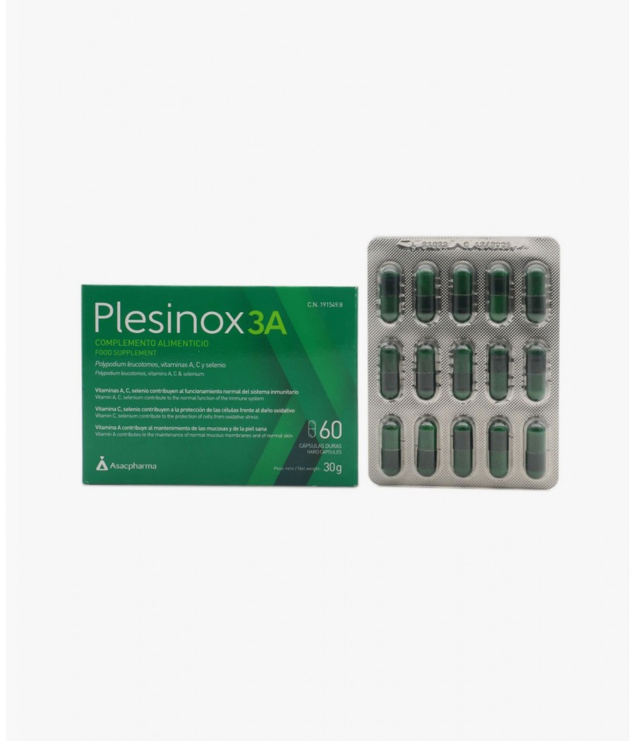 Plesinox 3A es un complemento alimenticio a base de Polypodium leucotomos, vitamina A, C y selenio; destinado a ayudar al normal funcionamiento del sistema inmunitario. A dar protección frente al daño oxidativo y a mantener la piel y las mucosas sanas.